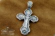 На лицевой стороне креста изображено Распятие Иисуса Христа. На обороте — короткая молитва, обращенная к Господу, которая традиционно помещается на нательных крестах: «Спаси и сохрани». Высота: 5.5 мм